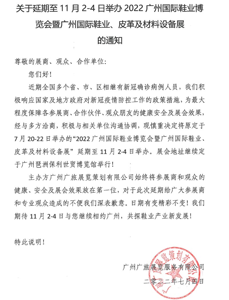 關(guān)于延期至11月2-4日舉辦2022廣州國際鞋業(yè)博覽會暨廣州國際鞋業(yè)、皮革及材料設(shè)備展的通知
