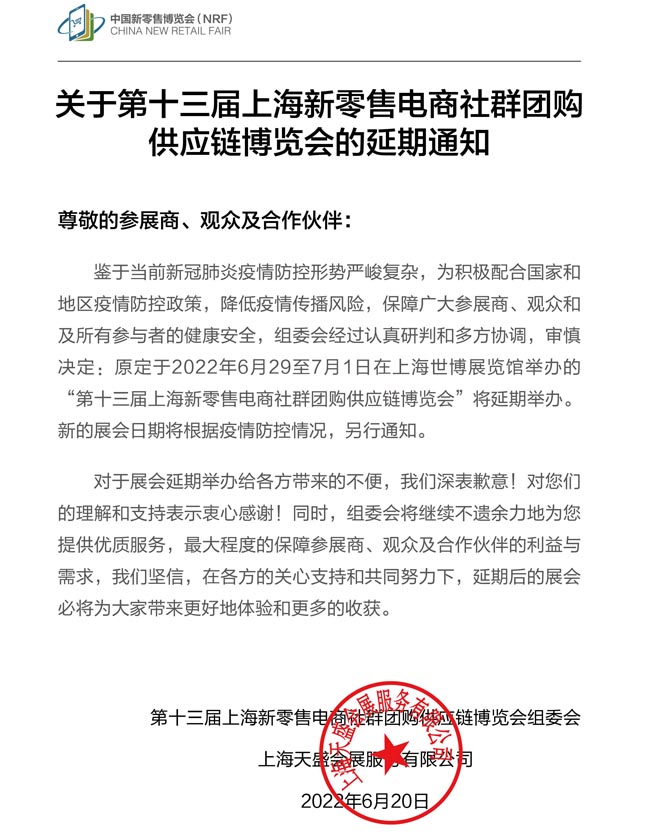 鑒于當前******炎**防控形勢嚴峻復雜,為積極配合國家和地區**防控政策,降低**傳播風險,保障廣大參展商、觀眾和及所有參與者的健康安全,組委會經過認真研判和多方協調,審慎決定:原定于2022年6月29至7月1日在.上海世博展覽館舉辦的“第十三屆_上海新零售電商社群團購供應鏈博覽會”將延期舉辦。新的展會日期將根據**防控情況,另行通知。
